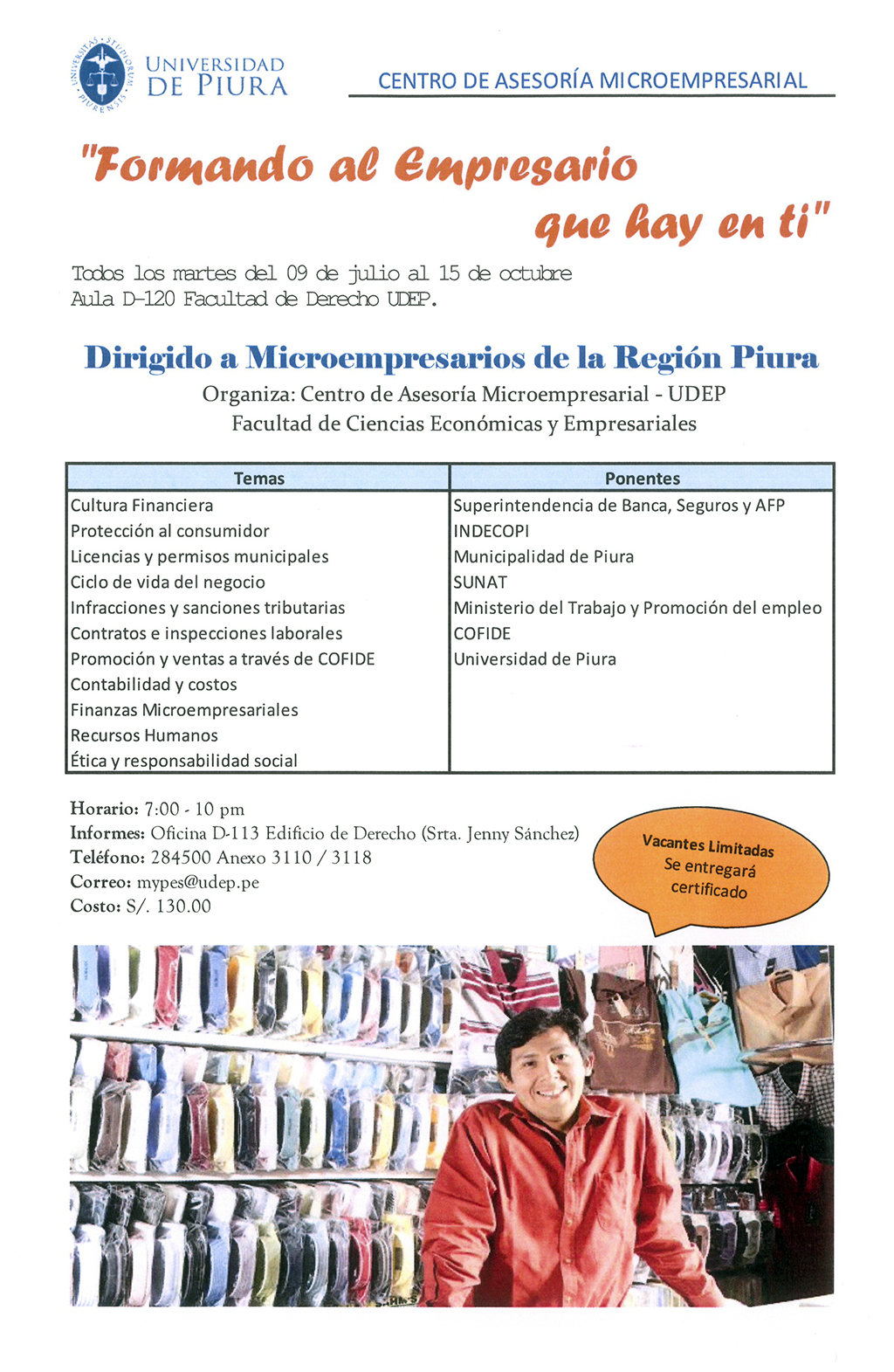 “Formando al empresario que hay en ti” es el taller que ha organizado el Centro de Asesoría Microempresarial (CAM) de la Universidad de Piura. Está dirigido a los micro y pequeños empresarios de la Región y a quienes deseen constituir su empresa. Las sesiones se desarrollarán los martes (de 7 a 10 de la noche) todos los martes hasta el 15 de octubre.