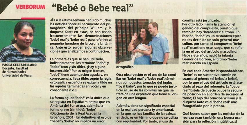 Por Julio Talledo. 02 agosto, 2013.En la última semana han sido muchas las noticias sobre el nacimiento del primogénito del príncipe William y la duquesa Kate; en estas, se han usado frecuentemente las denominaciones “bebé real” y “bebe real”, para referirse al pequeño heredero de la corona británica. Ante esto, surgen algunas observaciones que analizamos a continuación.