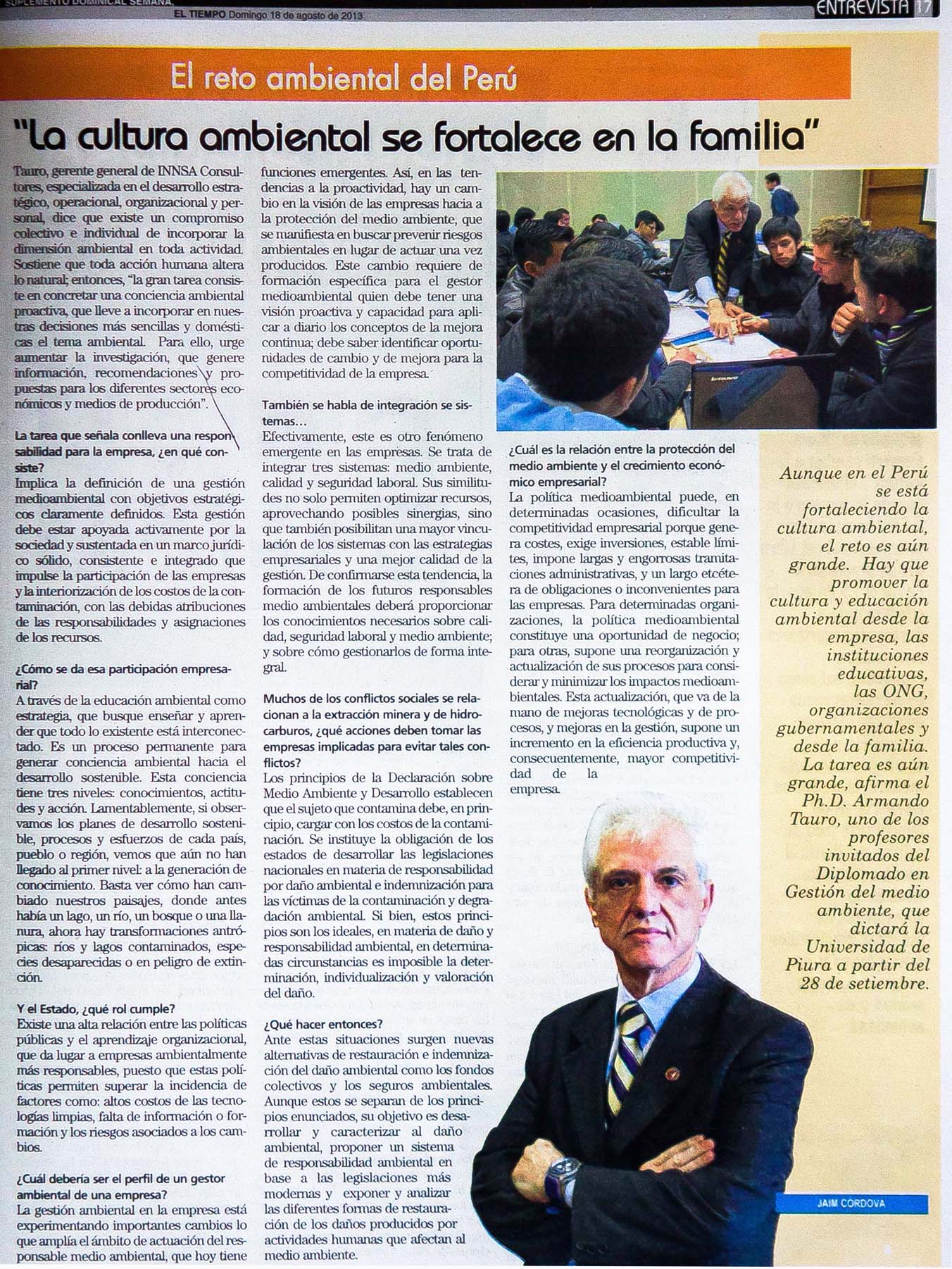 Entrevista al Ing. Armando Tauro, docente invitado al Diplomado en Gestión del medio ambiente. El experto reflexiona sobre la cultura y educación ambiental.