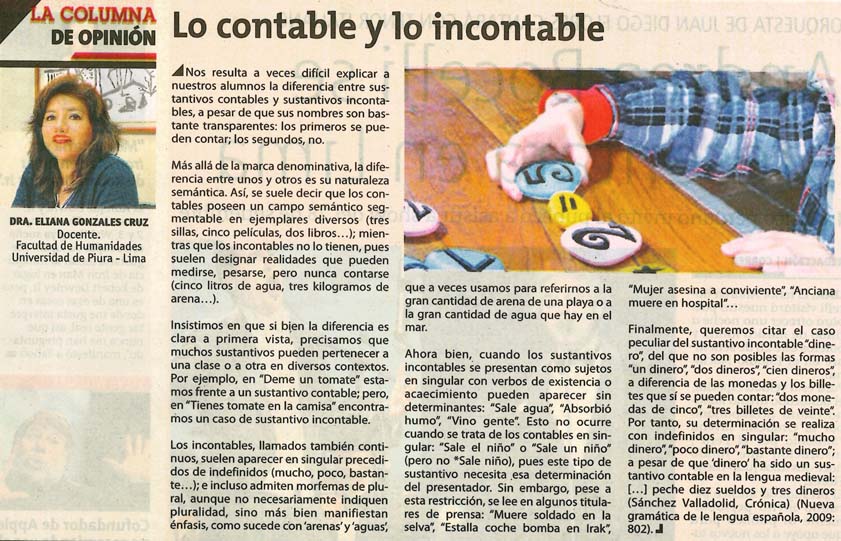 Por Eliana Gonzales. 19 agosto, 2013.Nos resulta a veces difícil explicar a nuestros alumnos la diferencia entre sustantivos contables y sustantivos incontables, a pesar de que sus nombres son bastante transparentes: los primeros se pueden contar; los segundos, no.