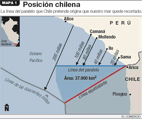 La posición peruana sostiene que la delimitación del límite marítimo entre ambas naciones está aún sin determinar, pues nunca se ha firmado un tratado específico de frontera marítima con Chile. Ante ello, lo que el Perú solicita es que se trace una línea equidistante en la franja donde existe una superposición de zonas marítimas.