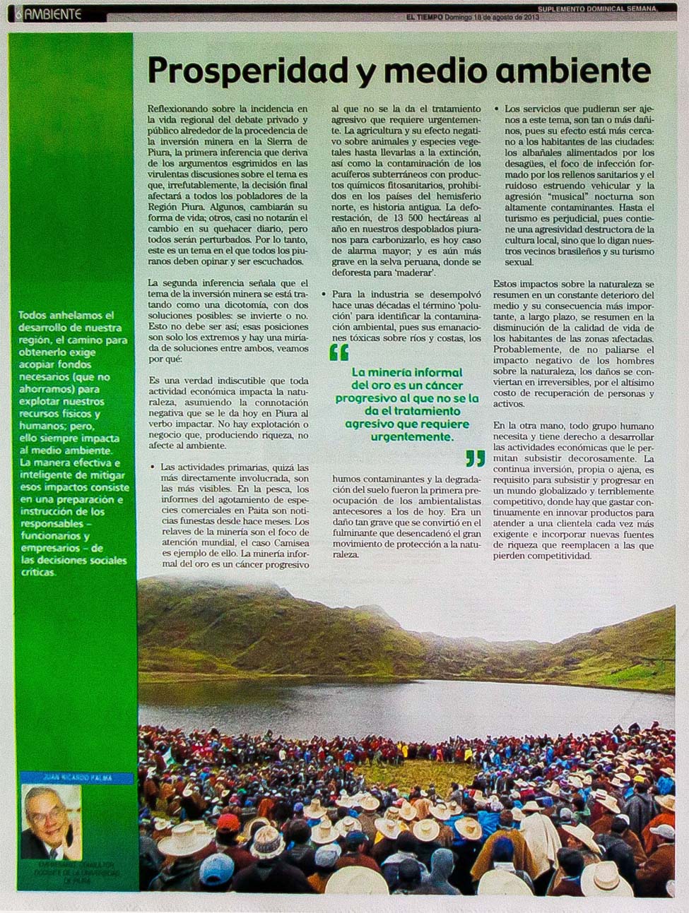 Por Juan Ricardo Palma. 20 agosto, 2013.Todos anhelamos el desarrollo de nuestra región, el camino para obtenerlo exige acopiar fondos necesarios (que no ahorramos) para explotar nuestros recursos físicos y humanos; pero, ello siempre impacta al medio ambiente. La manera efectiva e inteligente de mitigar esos impactos consiste en una preparación e instrucción de los responsables –funcionarios y empresarios– de las decisiones sociales críticas.