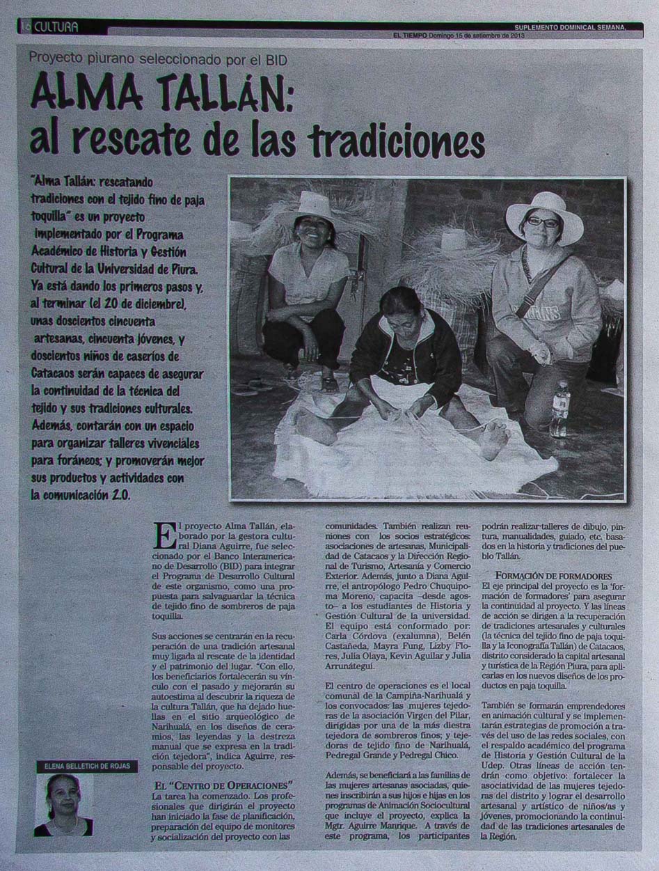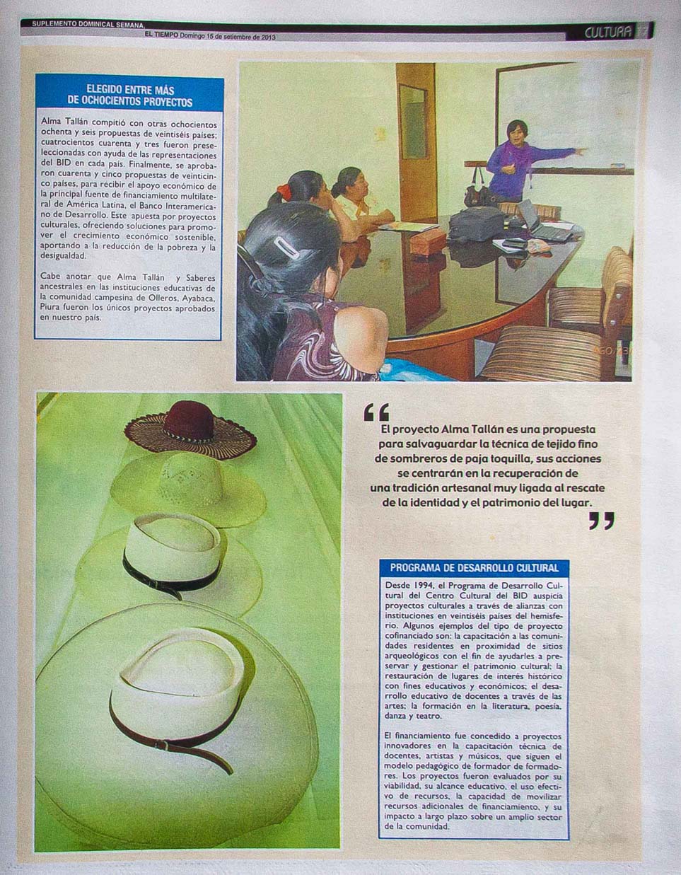 El proyecto Alma Tallán, elaborado por la gestora cultural Diana Aguirre, fue seleccionado por el Banco Interamericano de Desarrollo (BID) para integrar el Programa de Desarrollo Cultural de este organismo, como una propuesta para salvaguardar la técnica de tejido fino de sombreros de paja toquilla.
