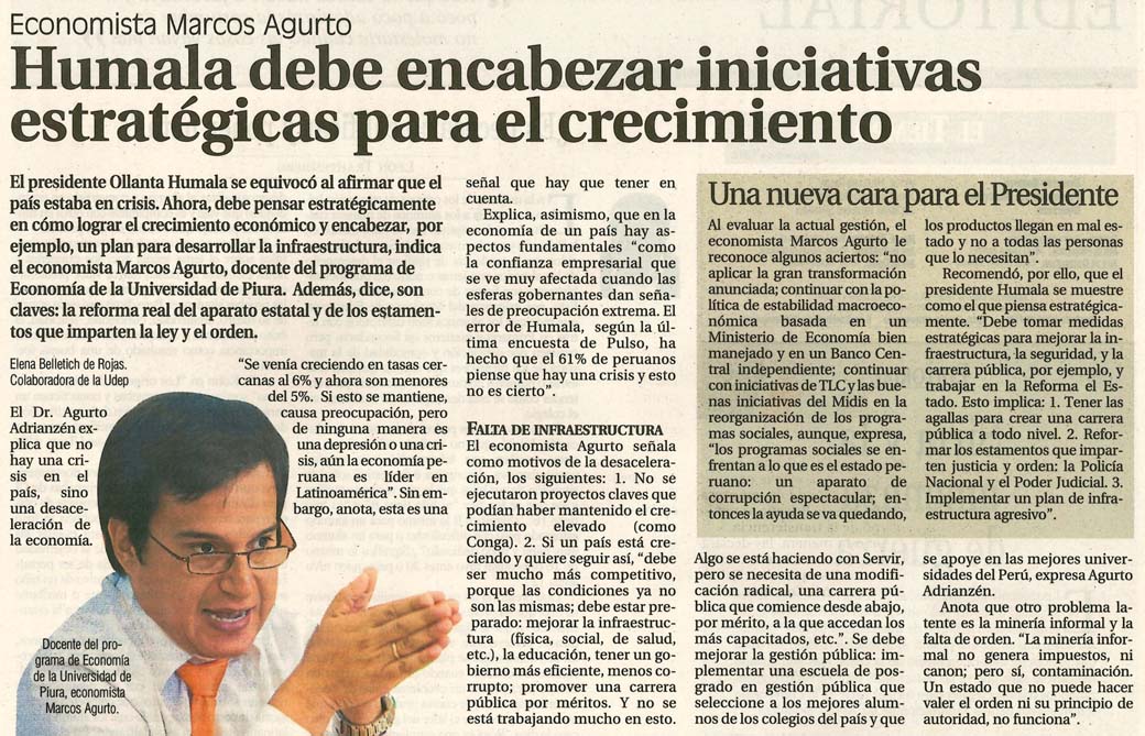 marcos agurtoEl Presidente se equivocó al afirmar que el país estaba en crisis. Ahora, debe pensar estratégicamente en cómo lograr el crecimiento económico y encabezar,  por ejemplo, un  plan para desarrollar la infraestructura, indica el economista Marcos Agurto, docente del programa de Economía de la Universidad de Piura.  Además, dice, son claves: la reforma real del aparato estatal y de los estamentos que imparten la ley y el orden.