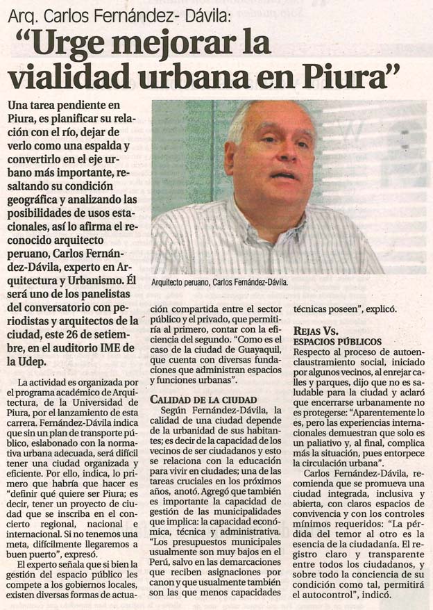 La actividad es organizada por el programa académico de Arquitectura, de la Universidad de Piura, por el lanzamiento de esta carrera. Fernández-Dávila indica que sin un plan de transporte público, eslabonado con la normativa urbana adecuada, será difícil tener una ciudad organizada y eficiente. Por ello, indica, lo primero que habría que hacer es “definir qué quiere ser Piura; es decir, tener un proyecto de ciudad que se inscriba en el concierto regional, nacional e internacional. Si no tenemos una meta, difícilmente llegaremos a buen puerto”, expresó.