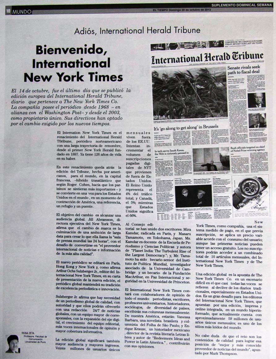 Por Rosa Zeta de Pozo. 21 octubre, 2013.El 14 de octubre fue el último día que se publicó la edición europea del International Herald Tribune, diario que pertenece a The New York Times Co. La compañía posee el periódico desde 1968 –en alianza con el Washington Post– y desde el 2003, como propietario único. Sus directivos han optado por el cambio exigido por los nuevos tiempos.