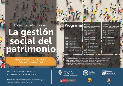 Con el fin de promover la importancia de incentivar la creación de proyectos y programas culturales – educativos, que permitan una mayor y mejor valoración del patrimonio por parte de la sociedad, la licenciatura de Historia y Gestión Cultural de la Universidad de Piura organiza el I Encuentro internacional sobre la gestión social del patrimonio.