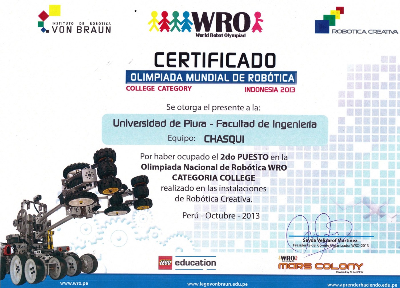 Por Javier Távara Farfán. 29 octubre, 2013.El equipo Chasqui, conformado por Álvaro Vásquez, César Cherre y Daniel Oquelis, y los entrenadores Raúl Burneo y Diego Purizaga, del programa académico de Ingeniería Mecánico Eléctrica, de la Universidad de Piura, obtuvo el segundo lugar, de la categoría College, en la Olimpiada Nacional de Robótica WRO 2013, organizada por el Instituto de Robótica Von Braun y desarrollada el 26 de octubre en las instalaciones de Robótica Creativa, en Lima.