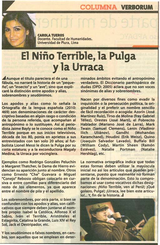 Por Carola Tueros. 05 noviembre, 2013.Aunque el título pareciera el de una fábula, no narraré la historia de un “pequeño”, un “insecto” y un “ave”; sino que explicaré la distinción entre apodos y alias, sobrenombres y seudónimos.