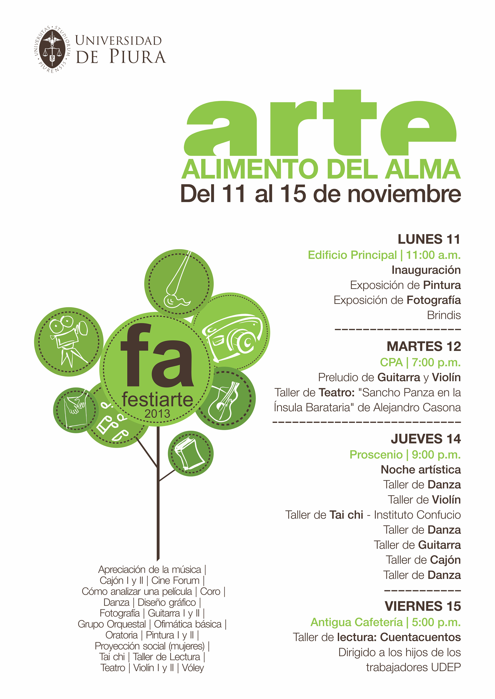 Por Kattia Alvarado. 08 noviembre, 2013.Con el objetivo de propiciar los saberes impartidos en las aulas de la UDEP y los valores solidarios en los estudiantes, acrecentando e incentivando en ellos un espíritu creador y artístico, la Facultad de Humanidades ha preparado una nueva edición del FESTIARTE 2013 en el que participarán alumnos de los diferentes programas académicos de la UDEP.