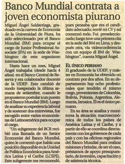 Miguel Ángel Saldarriaga, graduado de Economía de la UDEP, ocupará un cargo en la central de Washington.