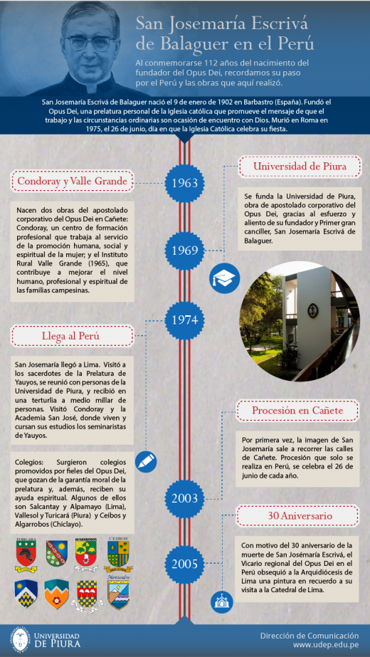 Por Claudia Reto. 10 enero, 2014.Esta semana conmemoramos uno año más del nacimiento de San Josemaría Escrivá de Balaguer, fundador de la Universidad de Piura y denominado ‘El santo de lo ordinario’ por el Papa Juan Pablo II. Recordemos su paso por el Perú y las obras que aquí realizó a través de la prelatura personal del Opus Dei.