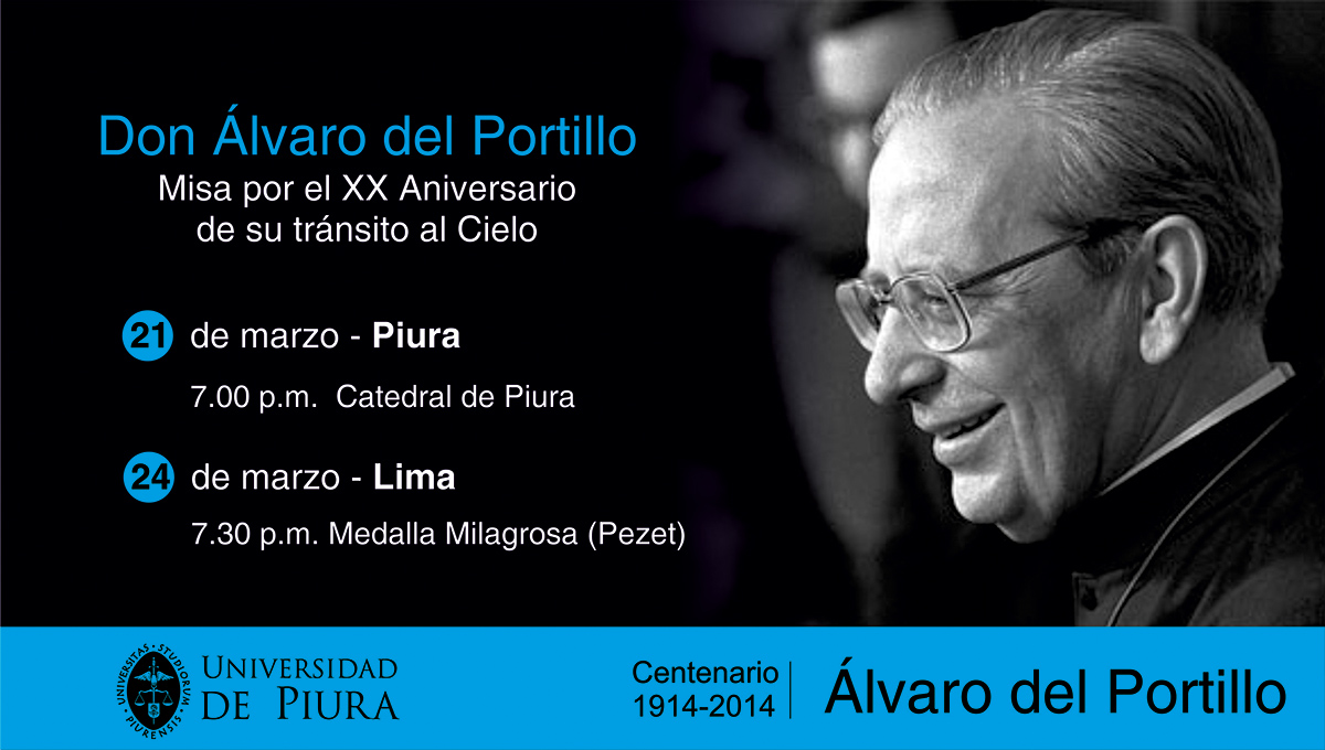 Por Elena Belletich Ruiz. 20 marzo, 2014.Este viernes, 21 de marzo, se celebrará la Santa Misa por el XX aniversario de la partida al cielo y la próxima beatificación de Don Álvaro del Portillo, quien fue Gran Canciller de la Universidad de Piura y Prelado del Opus Dei. La misa será a las 7:00 p. m. en la basílica Catedral de Piura; y el 24, a las 7: 30 p. m., en la parroquia Medalla Milagrosa (Pezet, Lima).