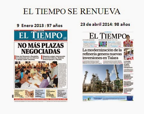 Por Aldo Chávez. 08 mayo, 2014.El diario El Tiempo, decano de la prensa piurana tiene 98 años de existencia. Con miras a su centenario, el pasado 23 de abril presentó una edición renovada. Un cambio de diseño, nuevo slogan, más páginas, entre otras novedades.