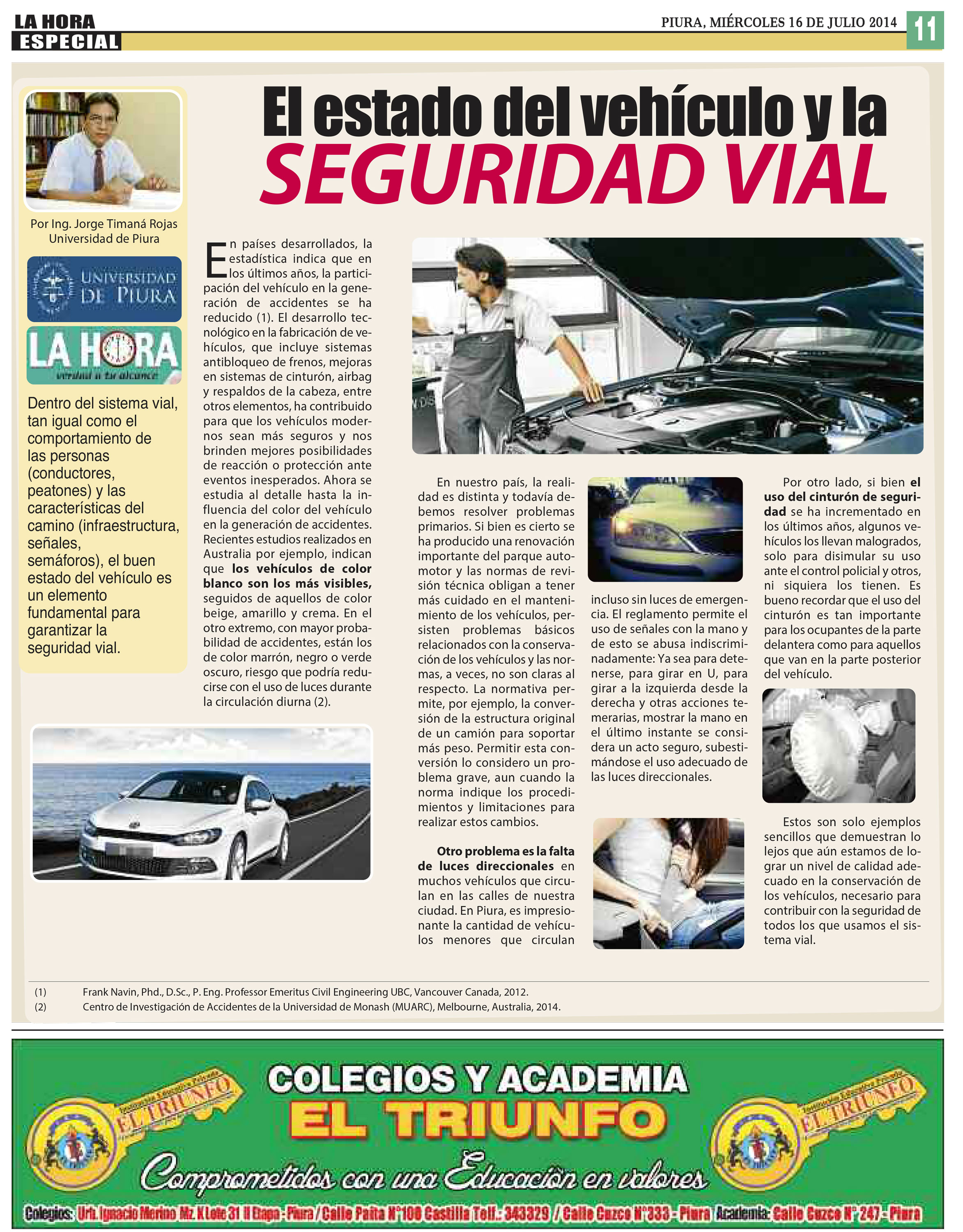 Por Jorge Timaná. 18 julio, 2014.Dentro del sistema vial, tan igual como el comportamiento de las personas (conductores, peatones) y las características del camino (infraestructura, señales, semáforos), el buen estado del vehículo es un elemento fundamental para garantizar la seguridad vial.