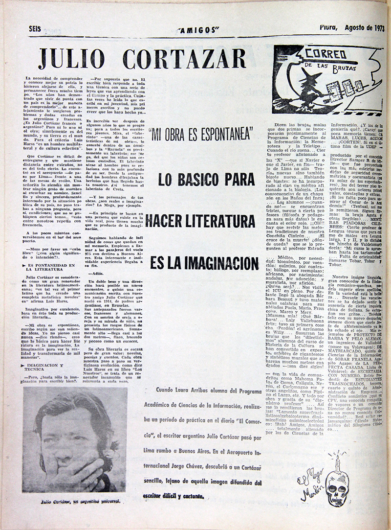 Por Dirección de Comunicación. 26 agosto, 2014.Cuando Laura Arribas, alumna del Programa Académico de Ciencias de la Información, realizaba un período de práctica en el diario “El Comercio”, el escritor argentino Julio Cortázar pasó por Lima rumbo a Buenos Aires. En el Aeropuerto Internacional Jorge Chávez, descubrió a un Cortázar sencillo, lejano de aquella imagen difundida del escrito difícil y cortante.