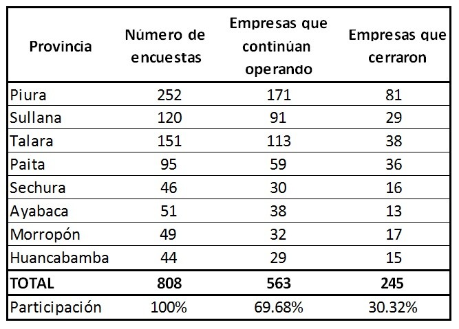 Este estudio analizó las razones del fracaso empresarial de las micro y pequeñas empresas formales en la Región Piura, siendo la definición de fracaso la que considera que la empresa dejó de operar, sin analizar las razones del cierre por parte del empresario que pueden ser: vacaciones, cambio de giro del negocio, viajes, vejez, fusiones o absorciones, las cuales hacen que la empresa se extinga legalmente.