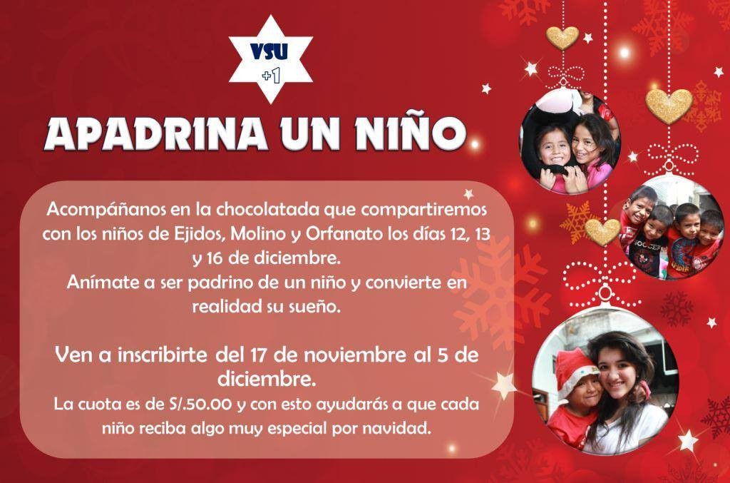 Anímate a ser padrino de un niño y convierte en realidad su sueño. Ven a inscribirte del 17 de noviembre al 5 de diciembre frente a Cafetería antigua (ingreso por la playa 1).