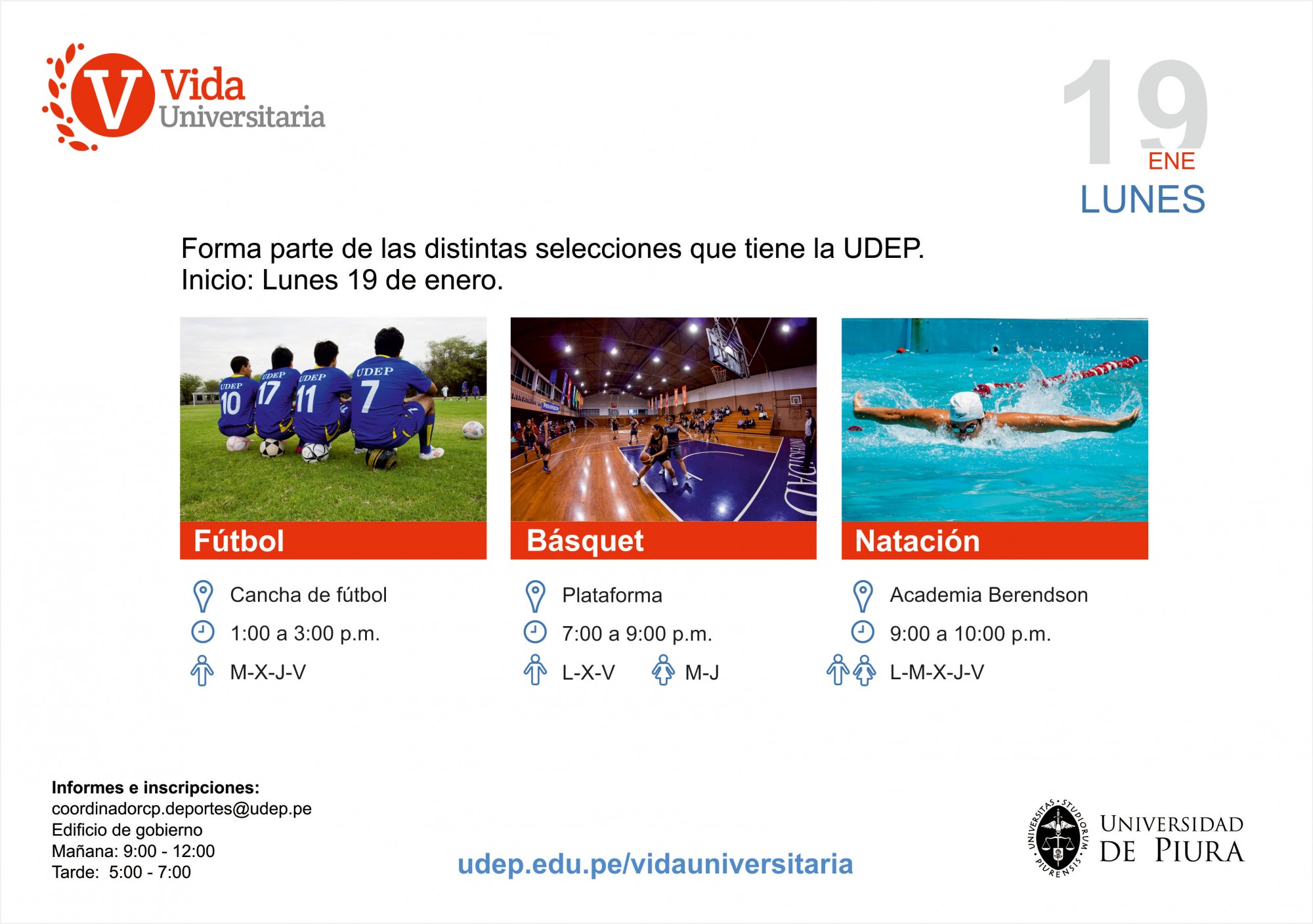 Vida Universitaria te invita a formar parte de las distintas selecciones que tiene la Universidad de Piura. Informes e inscripciones Email: coordinadorcp.deportes@udep.pe Edificio de Gobierno: 9:00 a.m. a 12:00 m y de 5:00 a 7:00 p.m. Teléfono: 284500 anexo 2404 ó #959048904