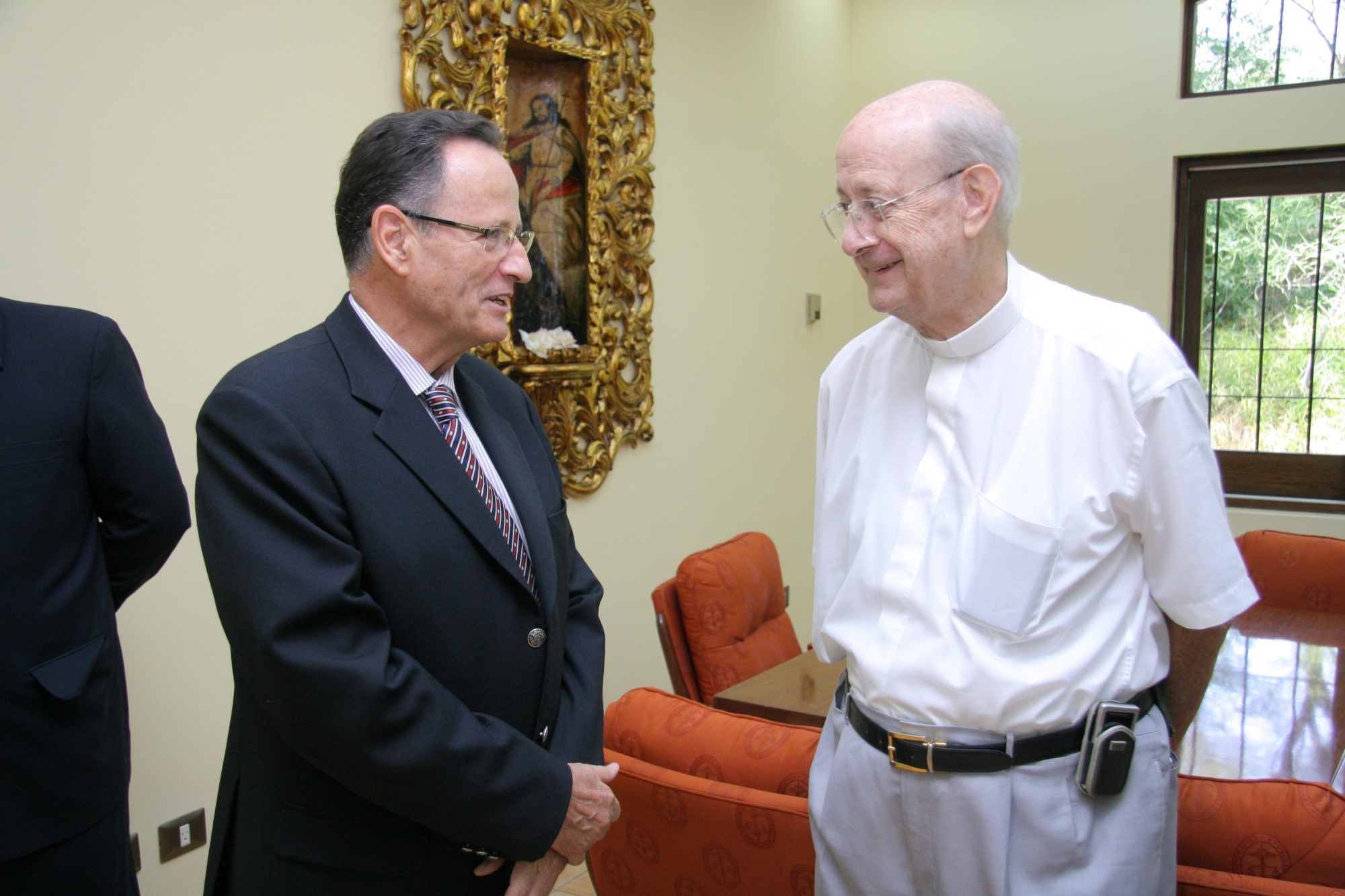 El doctor Antonio Abruña y el P. Pazos, durante el homenaje que la Universidad rindió a sus pioneros y benefactores en abril del 2009.