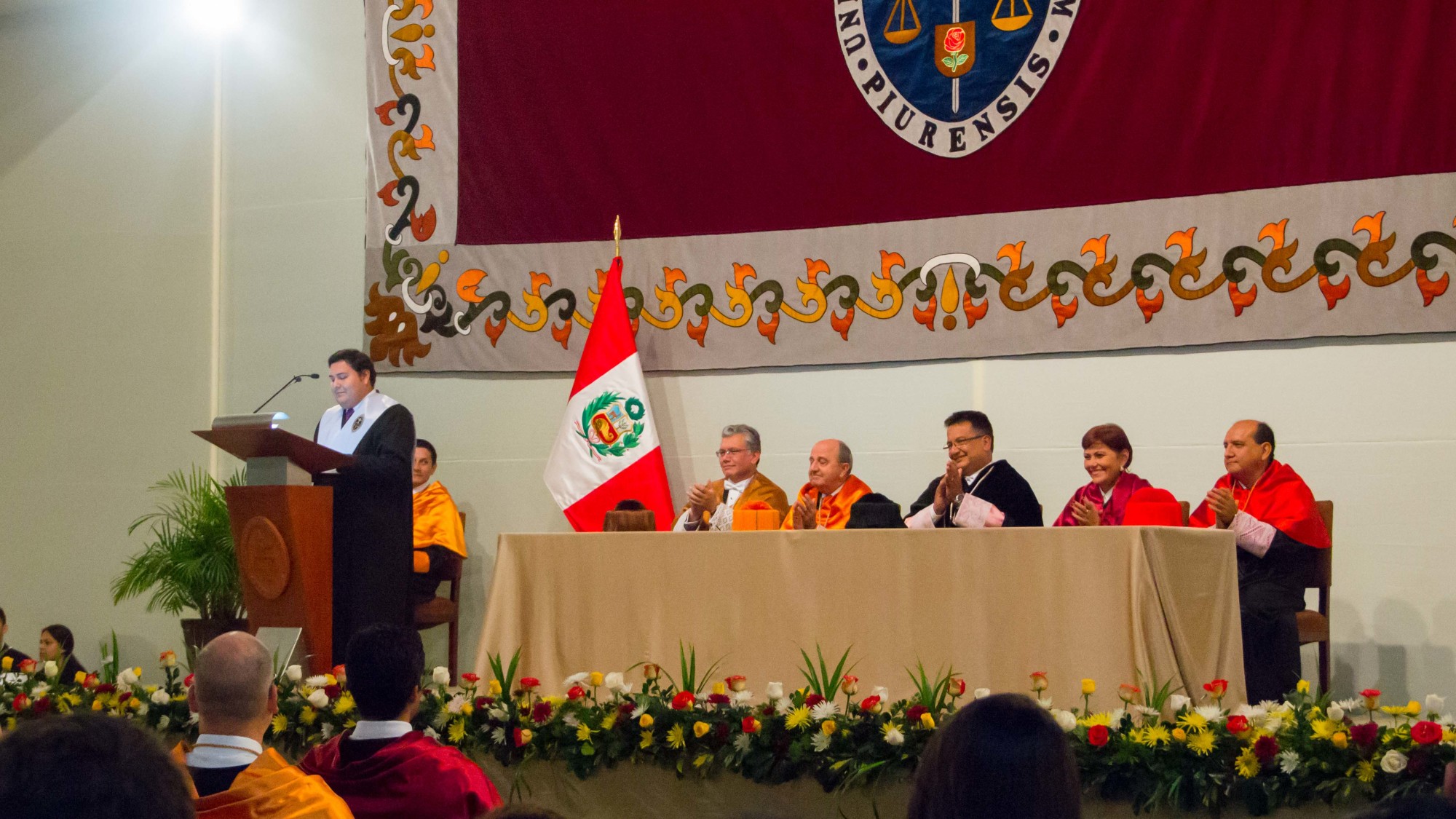 El rector de la Universidad de Piura, doctor Sergio Balarezo, se dirigió a ellos con un discurso donde evocó la memoria de uno de los forjadores de la Universidad, el P. Vicente Pazos González, quien falleció el último 26 de mayo. “No podía dejar de mencionar en este día de algarabía a don Vicente Pazos, pues gracias a él (y a la entrega de muchísimas otras personas) la Universidad de Piura es lo que ustedes conocen hoy. A él, nuestras gracias eternas y el compromiso de seguir forjando esta gran universidad con “‘unidad y audacia’, como siempre él siempre solía recordarnos”.