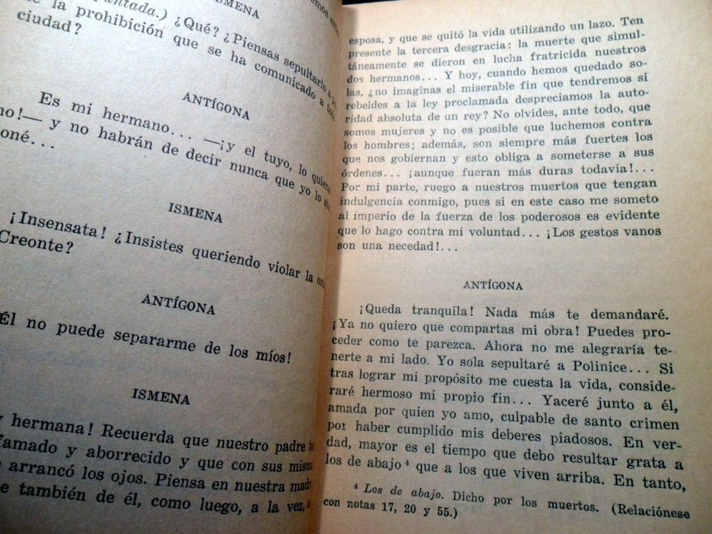 Por Ioanna Gallo. 10 junio, 2015.Antígona de Sófocles es un clásico de la literatura griega. La obra se desarrolla a partir del conflicto ético por la oposición entre lo moral y lo políticamente correcto; es decir, entre la ley moral y la social.