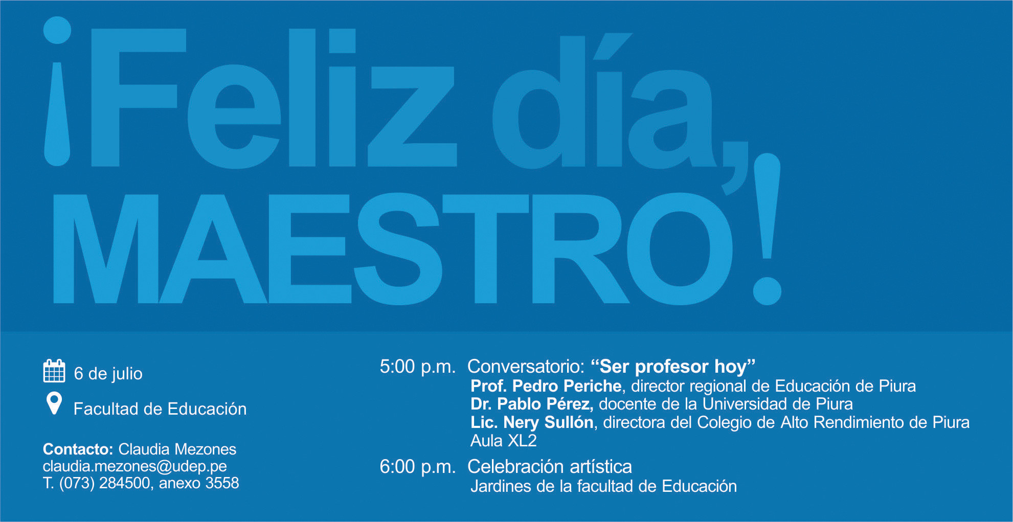 Por Elena Belletich Ruiz. 03 julio, 2015.La celebración, organizada por la Facultad de Ciencias de la Educación de la Universidad de Piura, tiene como objetivo destacar el valor de la labor docente y dar realce al Día del Maestro. En el conversatorio, denominado “Ser profesor hoy”, participarán: el director regional de Educación, Pedro Periche; el Dr. Pablo Pérez, exdecano de la Facultad de Ciencias de la Educación de UDEP; y Nery Sullón Barreto, directora del Colegio de Alto Rendimiento de Piura.