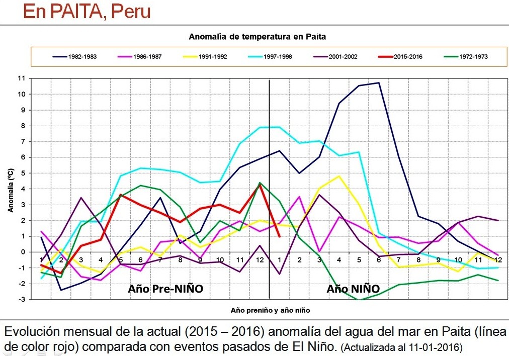 Por Elena Belletich Ruiz. 12 enero, 2016.En los gráficos del seguimiento del Fenómeno se muestra la evolución mensual de este parámetro, comparando con eventos de El Niño 82-83 y 97-98. En los primeros días de enero del 2016, se observa un apreciable descenso de la Temperatura Superficial del Mar ( TSM) en Paita.
