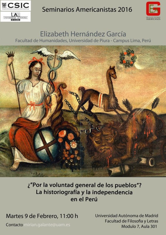 Por Ioanna Gallo. 17 febrero, 2016.La doctora Elizabeth Hernández García, docente de la Facultad de Humanidades, dictó la conferencia ¿Por la voluntad general de los pueblos? La historiografía y la independencia en el Perú, a profesores y alumnos de la carrera de Historia de la Facultad de Filosofía y Letras de la UAM. Este evento fue parte de los Seminarios Americanistas que organiza el Grupo de Estudios Americanos del Consejo Superior de Investigaciones Científicas de Madrid.
