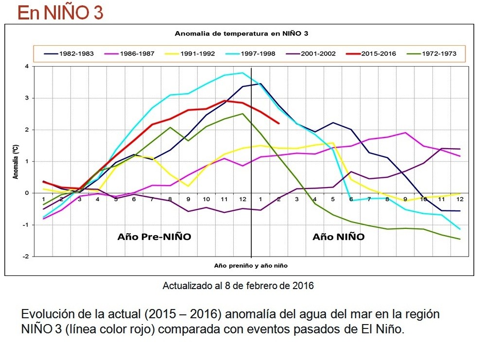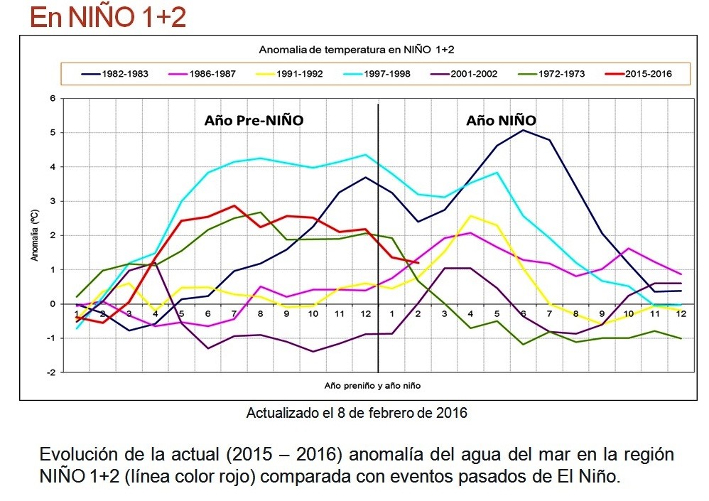 Por Elena Belletich Ruiz. 09 febrero, 2016.De acuerdo a las gráficas actualizadas del seguimiento de la anomalía de la temperatura del mar (TSM), relacionadas con El Niño, esta sigue disminuyendo. Al respecto, el MSc. Rodolfo Rodríguez, jefe de la Estación Meteorológica de la Universidad de Piura, señala que si continúa así “habría lluvias típicas de la estación de verano y no incentivadas por el calentamiento del mar. Hay que recordar que marzo es el mes más lluvioso del año y es muy probable que entonces se produzcan las mayores precipitaciones”.