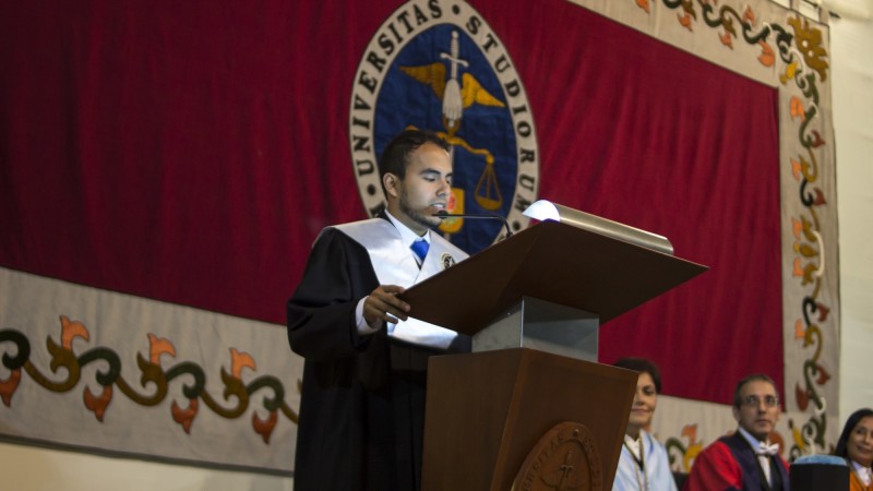 En representación de los nuevos bachilleres, Luis Zárate, egresado de Ingeniería Industrial y de Sistemas, se dirigió a los asistentes. “Al inicio de este discurso mencioné que pasé seis años por esta universidad. Quiero corregirme: Yo viví seis años en esta universidad, y si me dijeran que en esta noche me puedo llevar algo para recordarla, sinceramente, me llevaría a la mascota de mi facultad, Ingeniería. Porque representa el esfuerzo, el compañerismo, la unión y el apoyo que nos dábamos y el apoyo que nos daban los profesores”.
