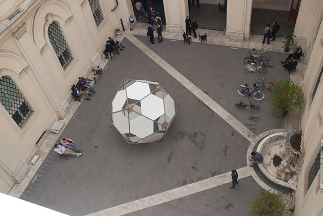 Esta obra fue instalada, como se ve en la fotografía, en el “Cortile” del Palazzo dell’Apollinare, sede de la Universidad Pontificia de la Santa Cruz, en que se celebró el foro.