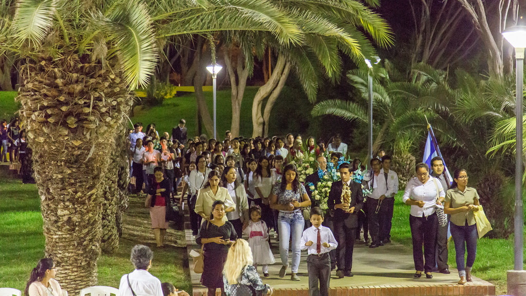 El segundo altar estuvo en la parte posterior de la Biblioteca. La noche piurana fue el escenario perfecto, para que resalte la devoción y la unidad de los ‘peregrinos’, entre los que había niños e infantes en brazos de su madre. Frente a la Familia de Nazaret, se terminó el rezo del Rosario.
