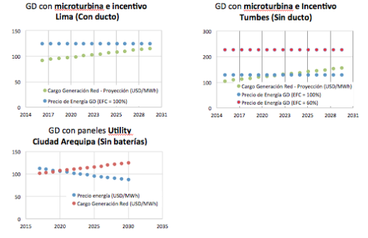 Una central solar grande puede ser rentable con un ingreso en el orden de US$ 60 MW por MW / hora. Una instalación solar domiciliaria, dependiendo de la ubicación, lo puede ser a un costo de aproximado de US$ 180 por MW / hora (Arequipa). “Algunos lugares están muy cerca de pagar a la compañía eléctrica lo mismo que les hubiera costado generar su propia energía” dijo el profesor Seclén. “El problema es que no está legislada la generación distribuida y hay poco conocimiento de la misma en la población “.