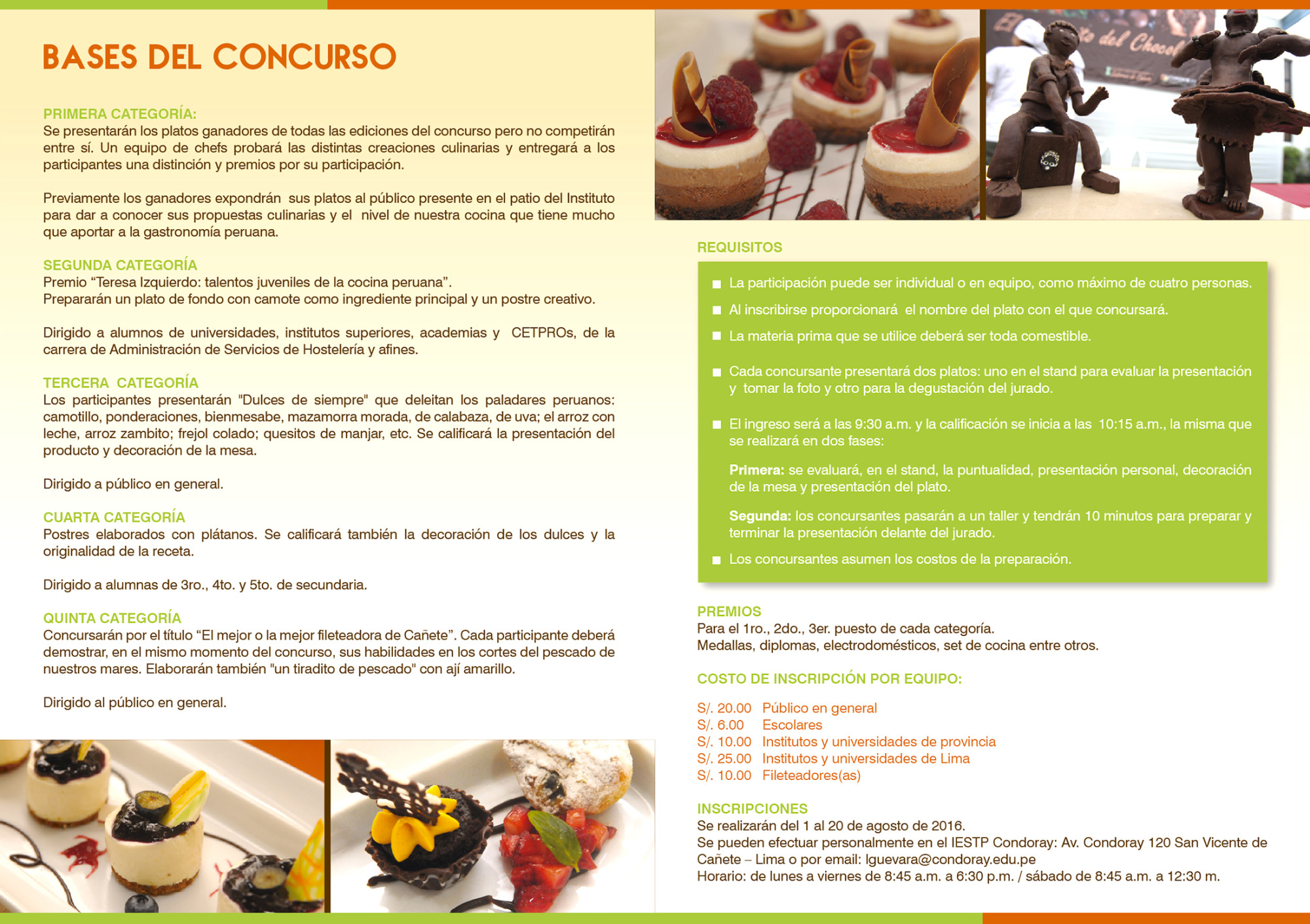 “Sabores de Cañete” se llevará a cabo en la sede de Condoray como parte de las actividades de la Semana de Cañete. Se puede participar en forma individual o en equipo de hasta cuatro integrantes. Quienes ocupen los tres primeros lugares en cada categoría serán premiados con medallas, trofeos y electrodomésticos y sets de cocinas donados por distintas empresas.