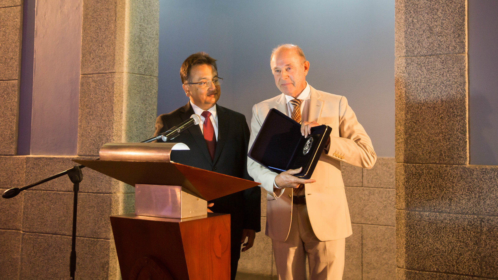 El doctor Balarezo Saldaña entregó un reconocimiento al presidente del directorio de El Tiempo, Juan Francisco Helguero, quien agradeció el apoyo de la UDEP, y su aporte de casi 50 años, como formador de generaciones de profesionales que también son parte de la historia de este medio.