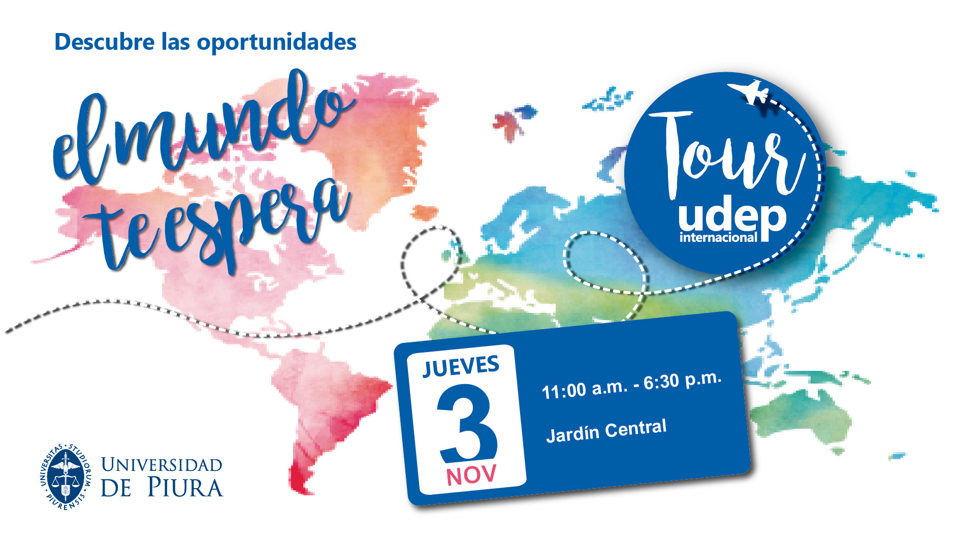 Por Dirección de Comunicación. 26 octubre, 2016.El próximo jueves 3 de noviembre, se realizará, en Campus Lima, la Feria “Tour UDEP Internacional”. Este espacio dirigido a los alumnos, docentes, egresados y comunidad universitaria, tiene como objetivo brindar información sobre todas las oportunidades de estudios que existen a nivel mundial, además de informarse sobre los requisitos que tienen los programas de becas internacionales.