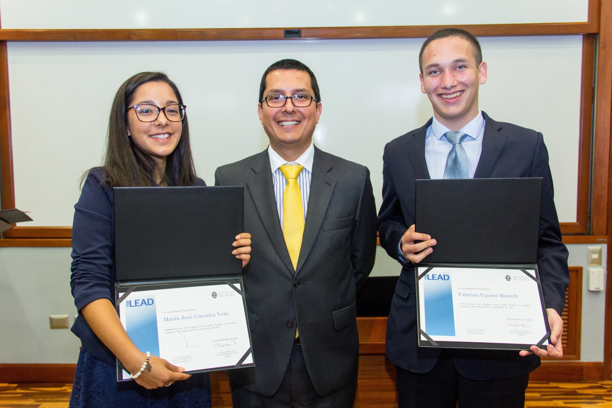 En presencia de profesores, padres de familia y amigos, los alumnos María José Corrales, del Colegio Villa Caritas; y Fabrizio Ugarte, del Colegio María Marianistas, recibieron la constancia que los acredita como ganadores de la Beca Lead. Esta fue entregada por el doctor Miguel Ángel Carpio, director del Departamento de Economía (Campus Lima) de la Facultad de Ciencias Económicas y Empresariales de la UDEP.