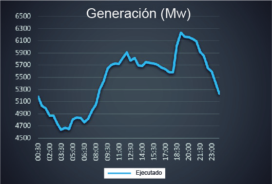 Durante el día la generación de electricidad varía según nuestras necesidades de consumo. Por la madrugada la potencia es mínima y se incrementa paulatinamente durante el día. Un diagrama típico de generación, como el del sábado 25 de marzo del 2017, es el siguiente: