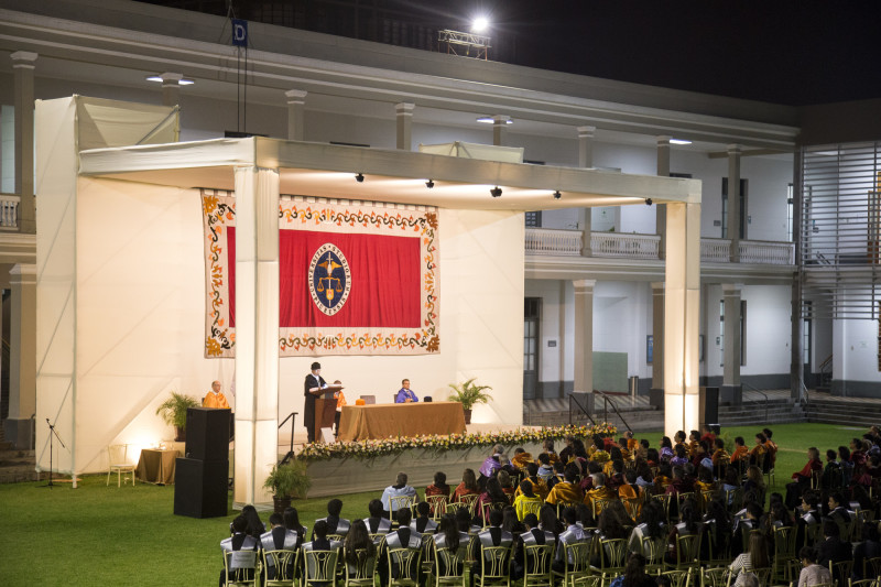 Antes de inaugurar el Año Académico, el rector, Dr. Sergio Balarezo, se refirió “a las circunstancias extraordinarias que ponen a prueba nuestro espíritu solidario”. En respuesta a esta situación, reflexionó sobre los dos importantes frentes que corresponden a una entidad educativa: la investigación científica y la formación profesional.