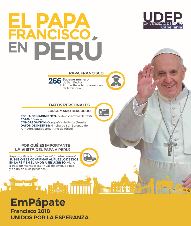 Con este motivo, Capellanía y Vida Universitaria, centros presentes en ambos campus de la Universidad, han iniciado la campaña “EmPápate”, con el objetivo de acercar el mensaje del Papa a la comunidad universitaria, para que quienes deseen, puedan prepararse espiritualmente para esta visita y organizar su participación en los eventos programados en Lima y Trujillo.