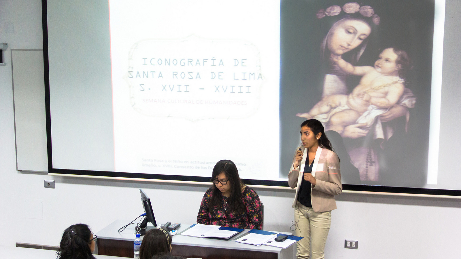 Por su parte, las alumnas de la Licenciatura de Historia y Gestión Cultural (Humanidades) María Elena Ruesta, María Alejandra Espinoza y Estephani Dioses; asesoradas por la profesora Djanira Aparicio, docente del Departamento de Historia y Arte de la Facultad de Humanidades; expusieron su investigación sobre la Iconografía de los siglos XVII y XVIII en torno a la figura de Santa Rosa de Lima, partiendo de la concepción de la mujer en el virreinato, la ubicación de la santa en ese período así como la iconografía que la representó durante los siglos XVII y XVIII.