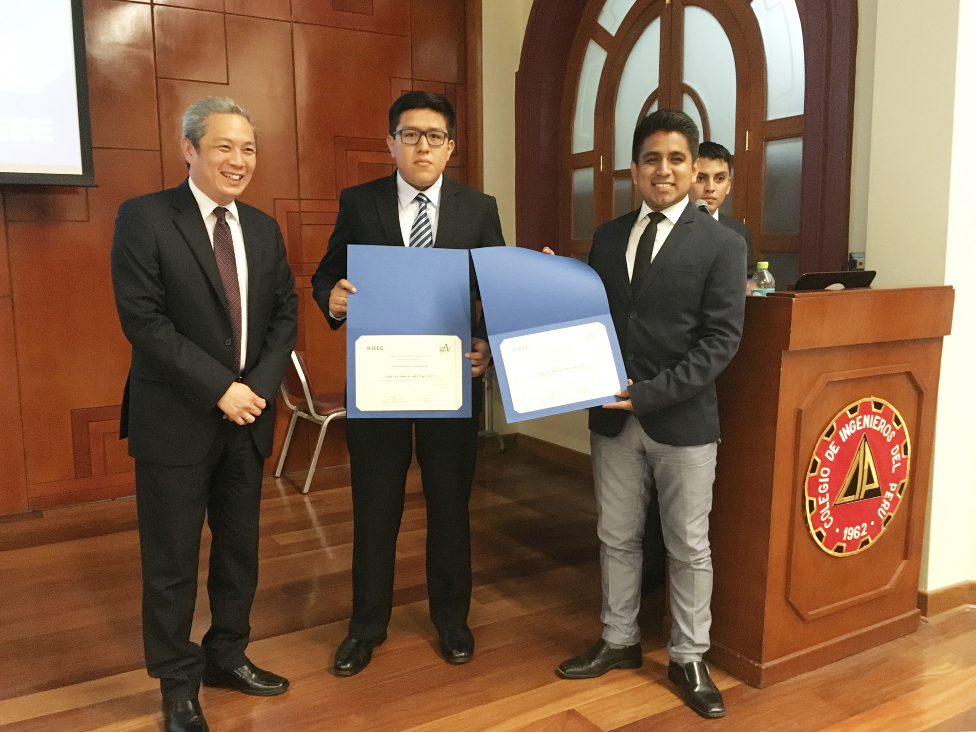Ivonne Chunga y Felipe Benites fueron premiados por su “Participación internacional”, mientras que Ademar Navarro obtuvo un reconocimiento como “Voluntario sobresaliente”. A la ceremonia asistieron representantes de capítulos estudiantiles IAS Perú de la Universidad de Piura, Universidad Nacional Mayor de San Marcos, Universidad Nacional de Ingeniería, Universidad Peruana de Ciencias Aplicadas, Universidad Tecnológica del Perú y Universidad Nacional Federico Villarreal.