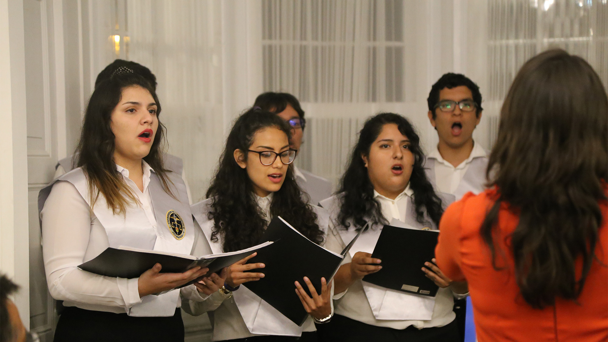 Acompañó estas palabras invitando al coro de la Universidad a presentar el himno sacro “Hanac Pachap”, compuesto por Juan Pérez Bocanegra.