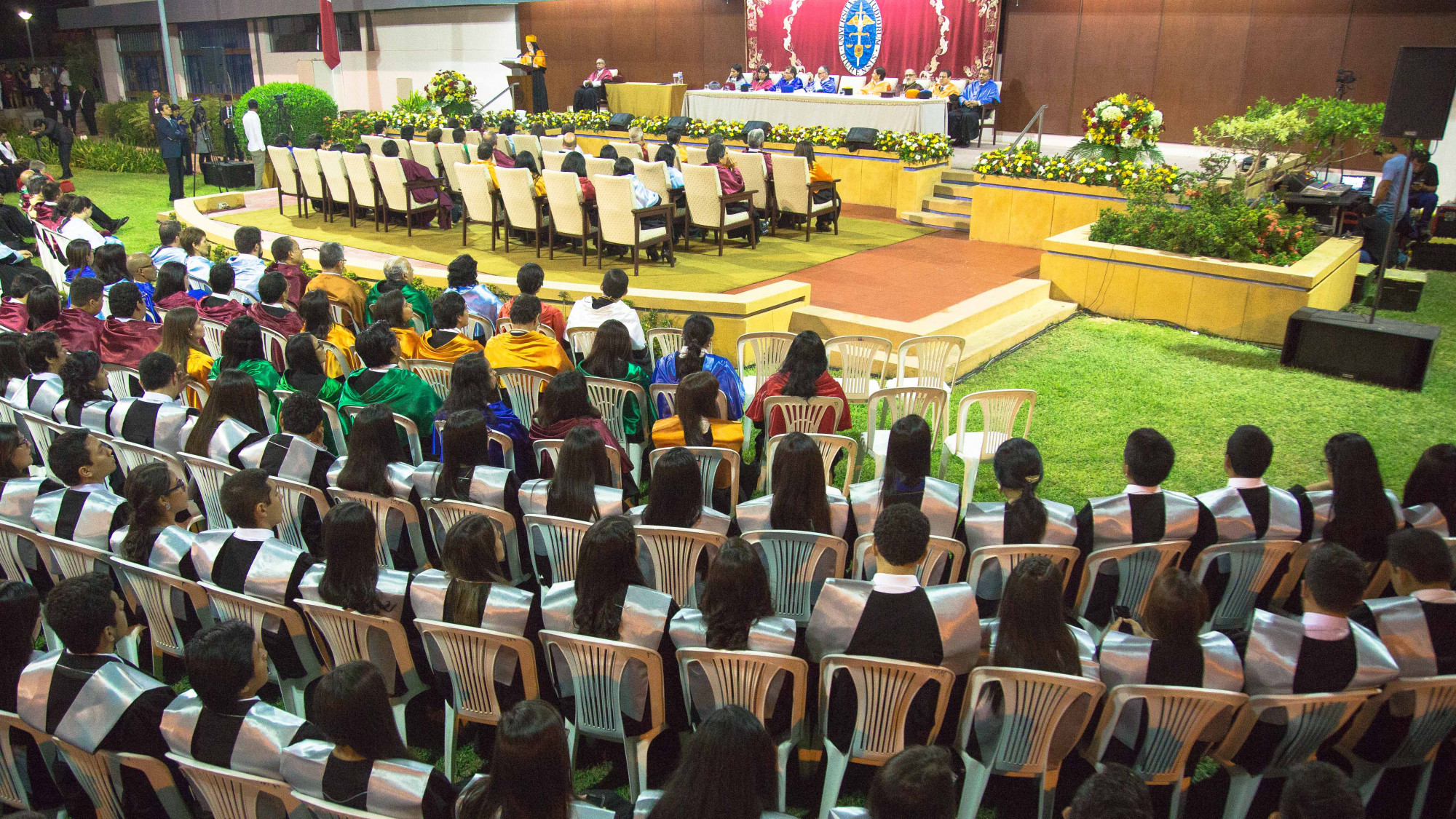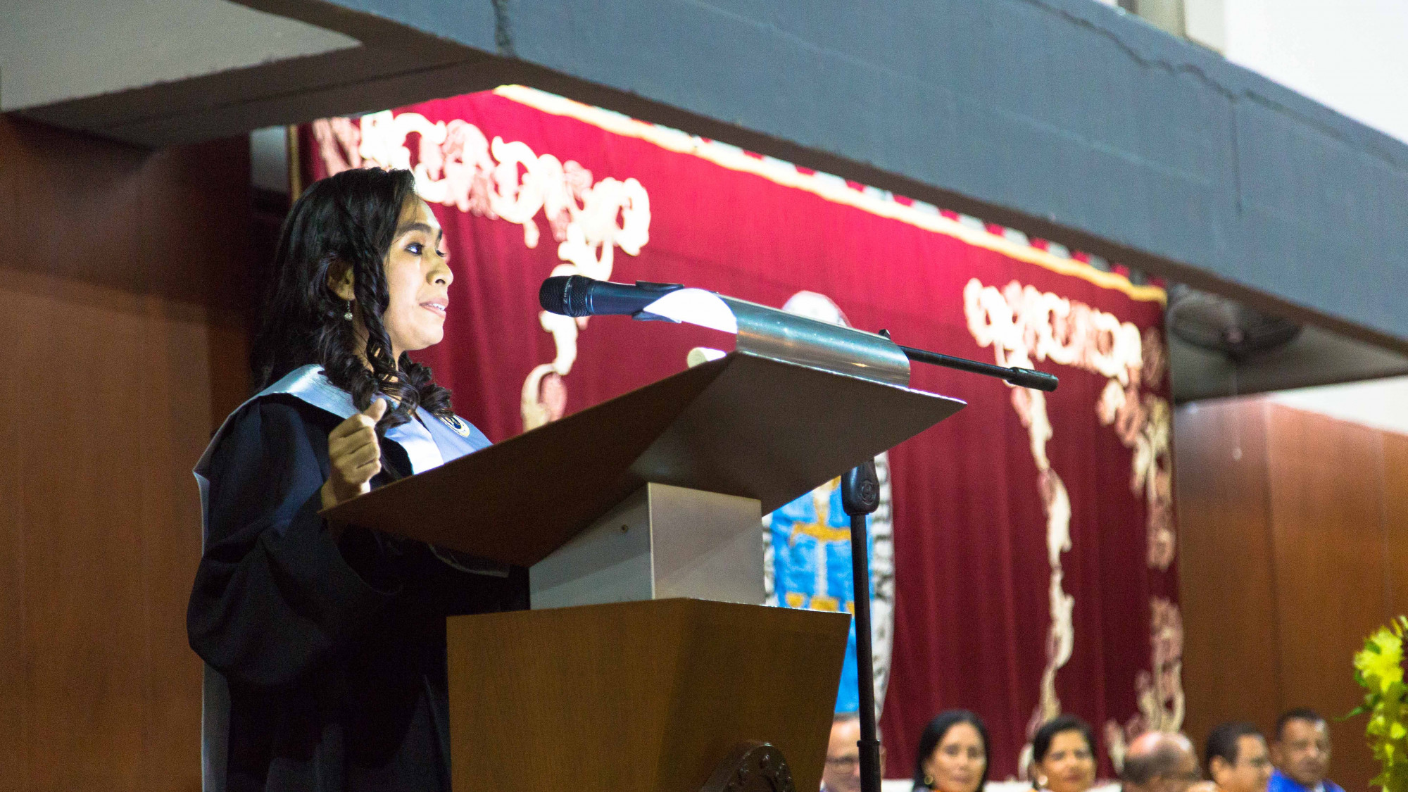 En un emotivo discurso, Patricia Yarlequé Ipanaqué, en representación de los 410 nuevos bachilleres, exhortó a sus compañeros a ser innovadores, pensar en el bienestar de la sociedad y a buscar soluciones a los problemas.