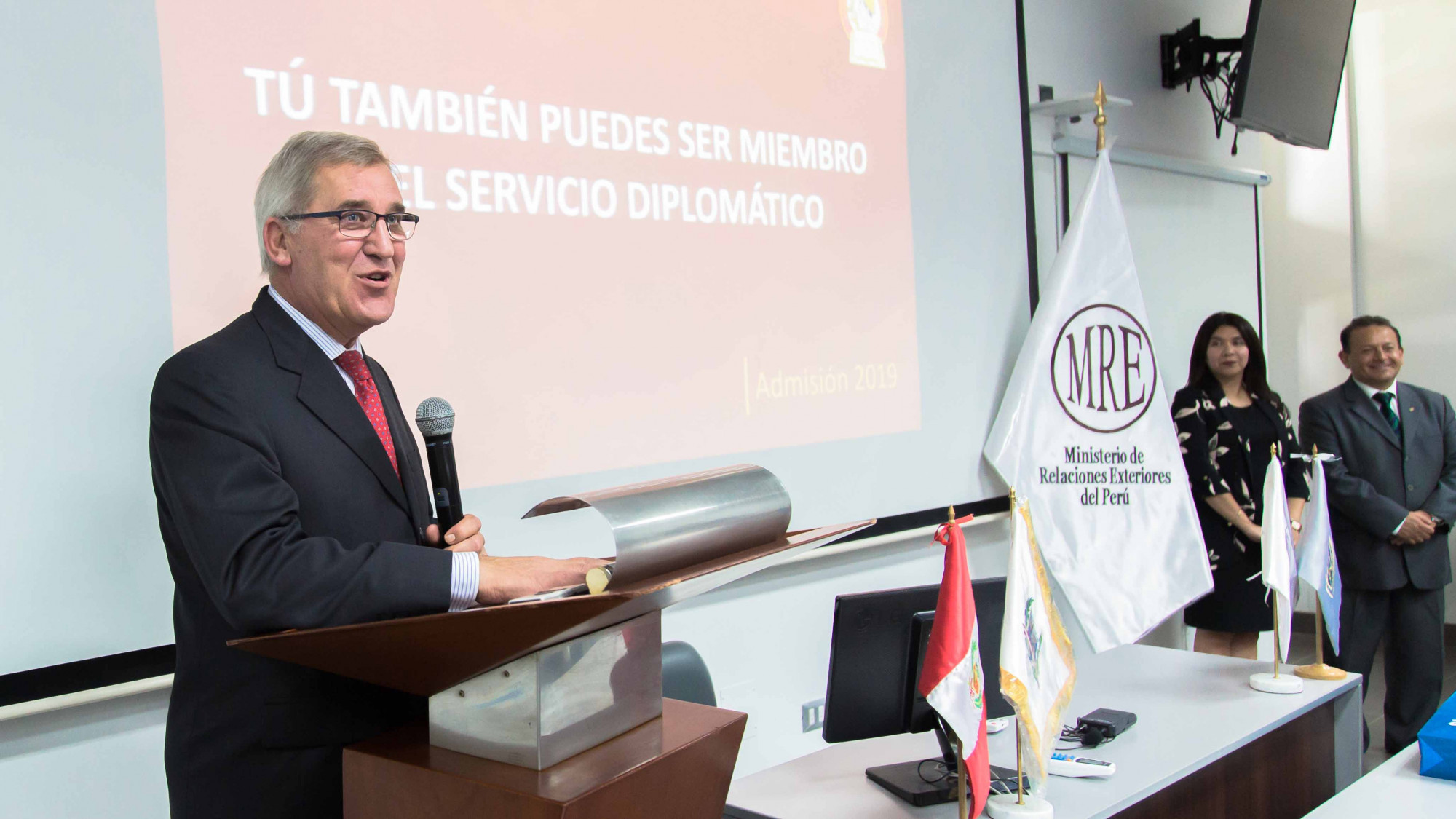 Ministros Consejeros y alumnos de la Academia Diplomática del Perú ofrecieron la charla “Tú también puedes ser miembro del servicio diplomático”. Allí, explicaron lo relacionado con el proceso de admisión y estudios.