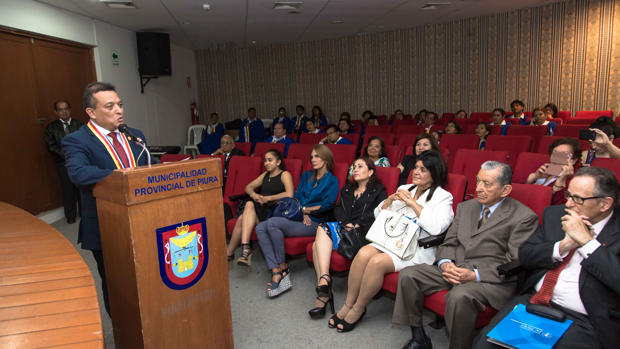 En el discurso de orden, el doctor Antonio Mabres dijo que el doctor Martín Sarango es uno de los muchos piuranos egresados de la UDEP, que han salido de Piura por necesidades de su desarrollo profesional. En su caso, primero por los estudios de posgrado realizados en Europa, y luego por los sucesivos retos profesionales que ha emprendido, siempre con el estímulo de dejar en alto el nombre de Piura.