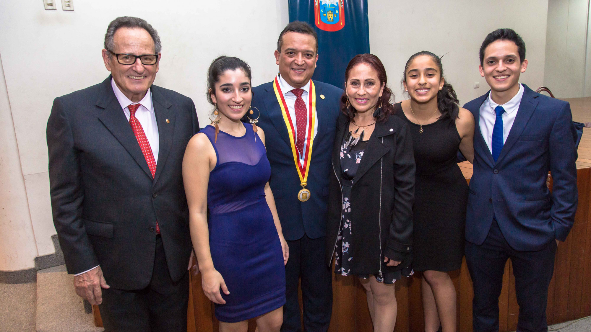 El homenajeado con el gobernador regional Reynaldo Hilbck, los congresistas Karla Schaefer y Freddy Sarmiento, y el alcalde Oscar Miranda.