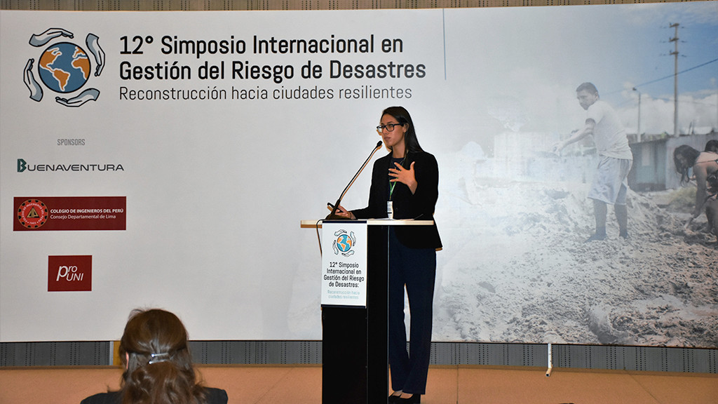 Claudia Ramírez, tesista de la Facultad de Ingeniería, fue expositora en el 12º Simposio Internacional en Gestión del Riesgo de Desastres, realizado en Lima.