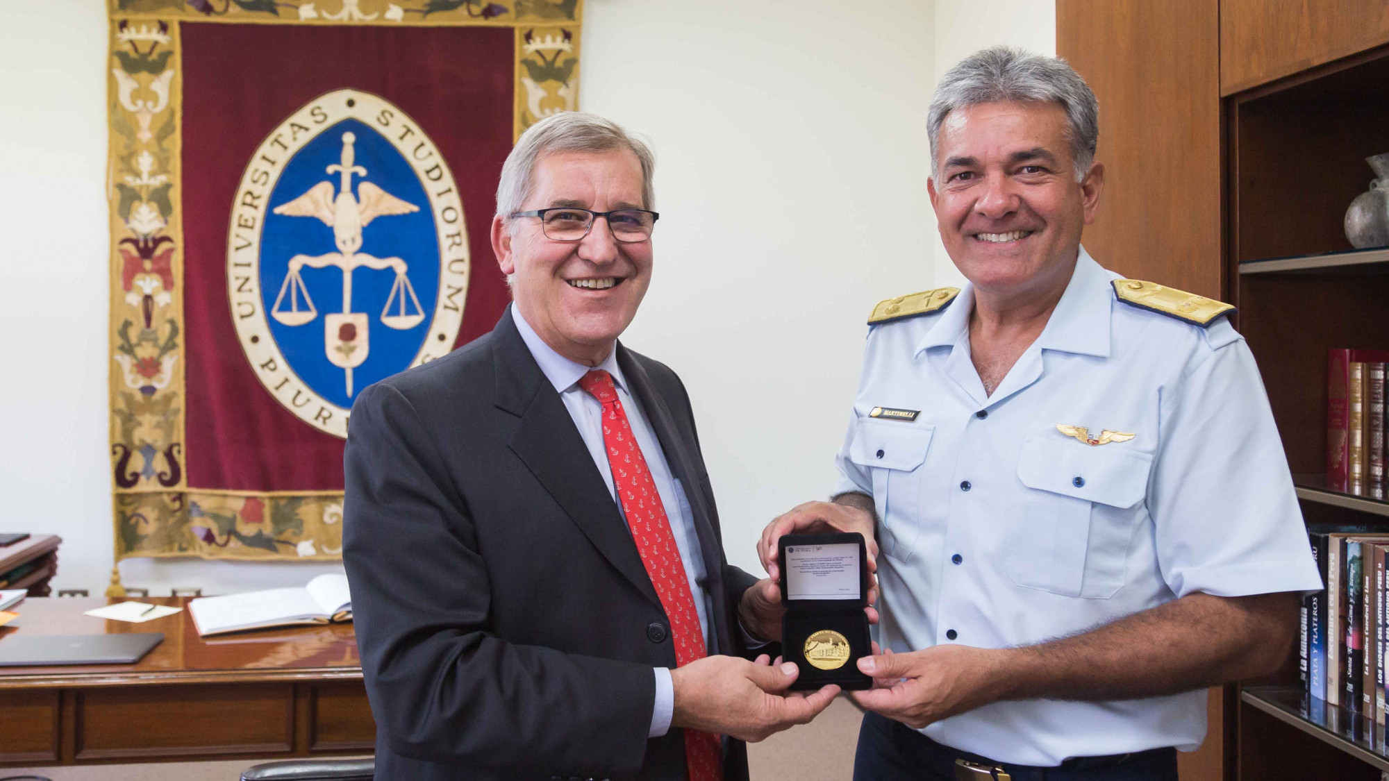 Por su parte, el rector de la Universidad de Piura, doctor Antonio Abruña, tras reafirmar los vínculos de amistad y colaboración con la FAP y detallar los proyectos de desarrollo en los que se encuentra participando la UDEP en beneficio de la región, entregó al visitante la Medalla conmemorativa de los 50 años de esta Universidad.